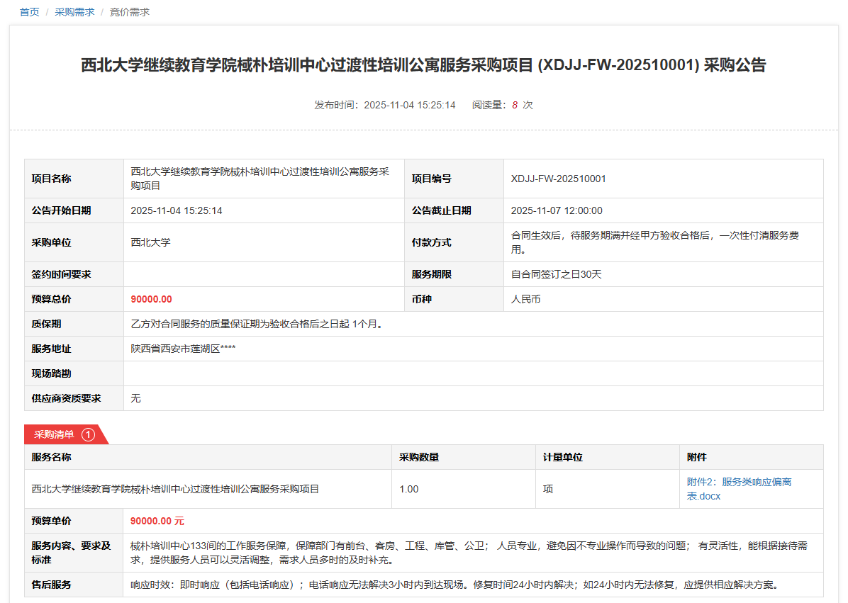 国产精品九九久久一区hh继续教育学院棫朴培训中心过渡性培训公寓服务采购项目(XDJJ-FW-202510001)竞价采购公告