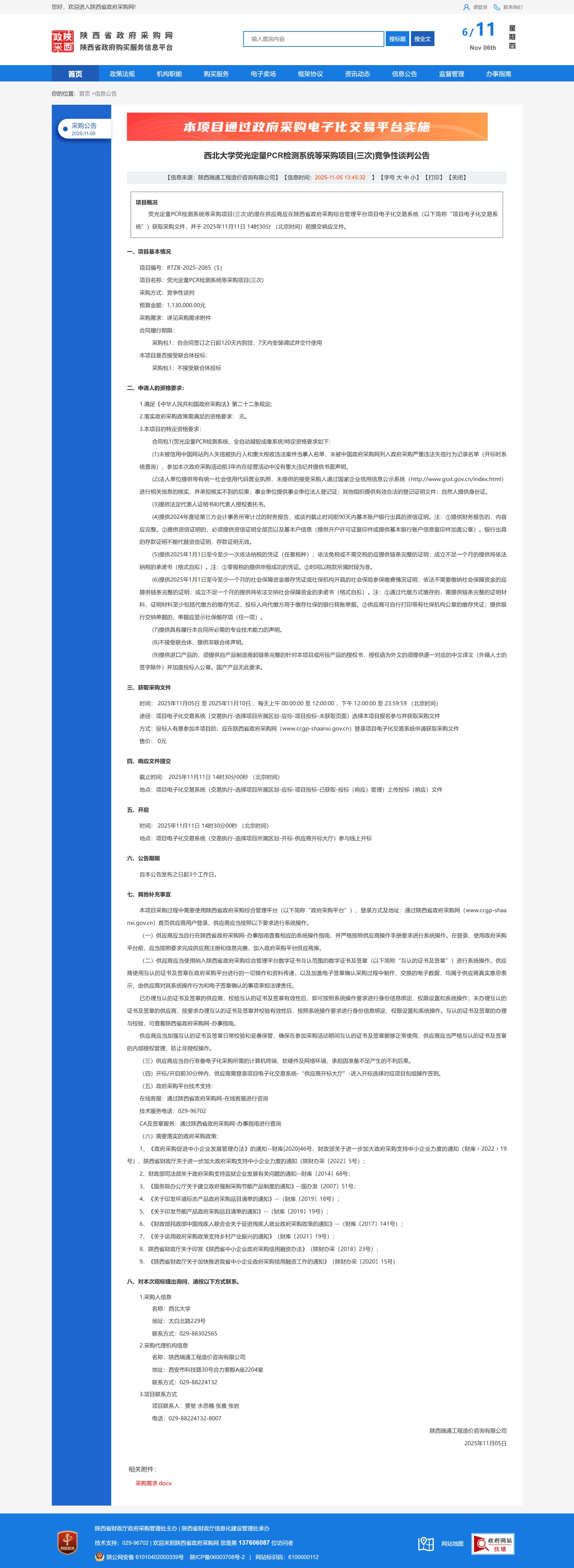 国产精品九九久久一区hh荧光定量PCR检测系统等采购项目(三次)竞争性谈判公告 作者: 编辑:国有资产管理处 时间:2025-11-06 原公告链接:https://www.ccgp-shaanxi.gov.cn/freecms/site/shaanxi/ggxx/info/2025/8a69c9fd99f7767f019a5285c1940c9a.html?noticeType=001013¬iceId=d91ac8d2-ba0c-11f0-8063-08c0eb20c666