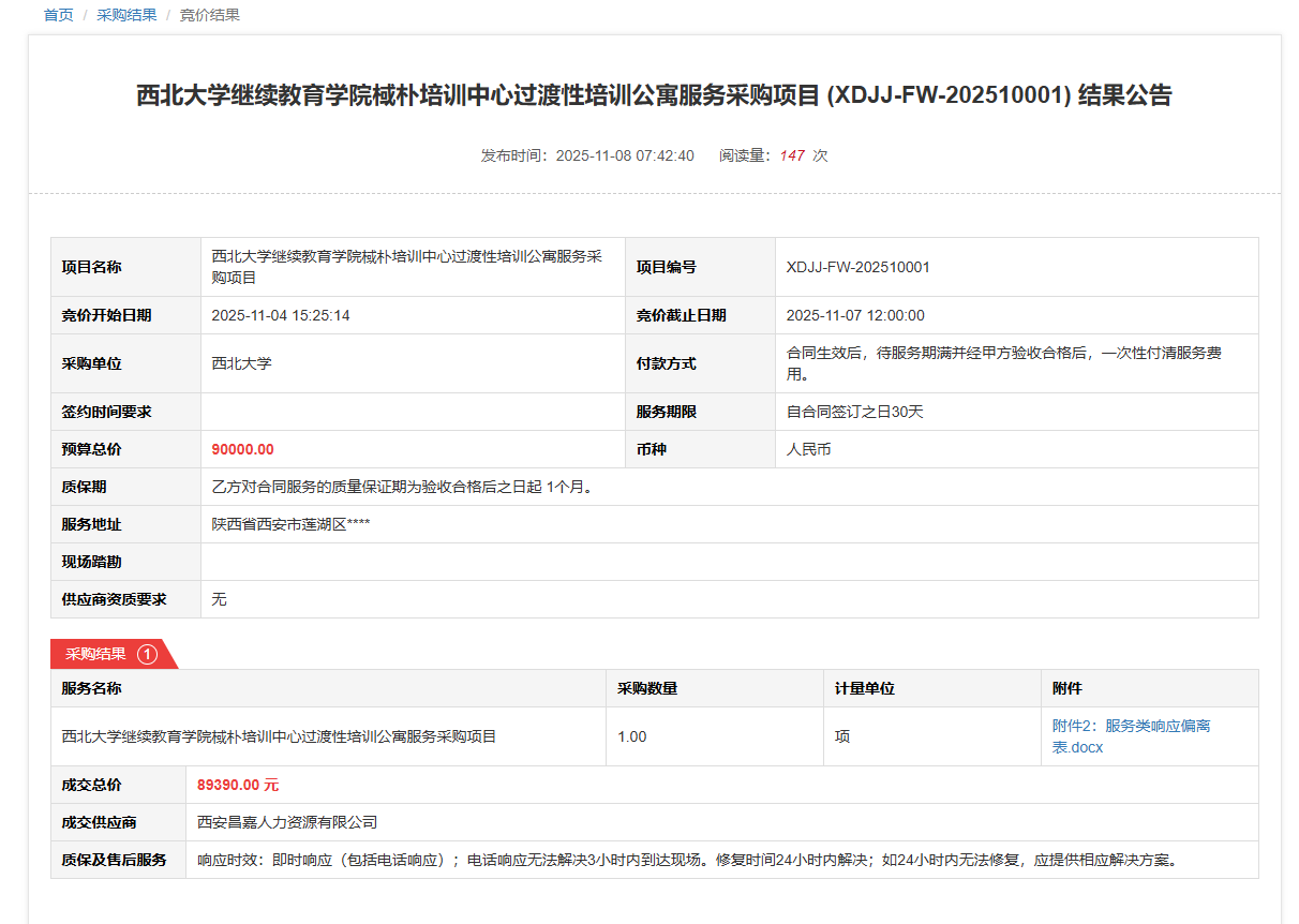 国产精品九九久久一区hh继续教育学院棫朴培训中心过渡性培训公寓服务采购项目(XDJJ-FW-202510001)竞价结果公告