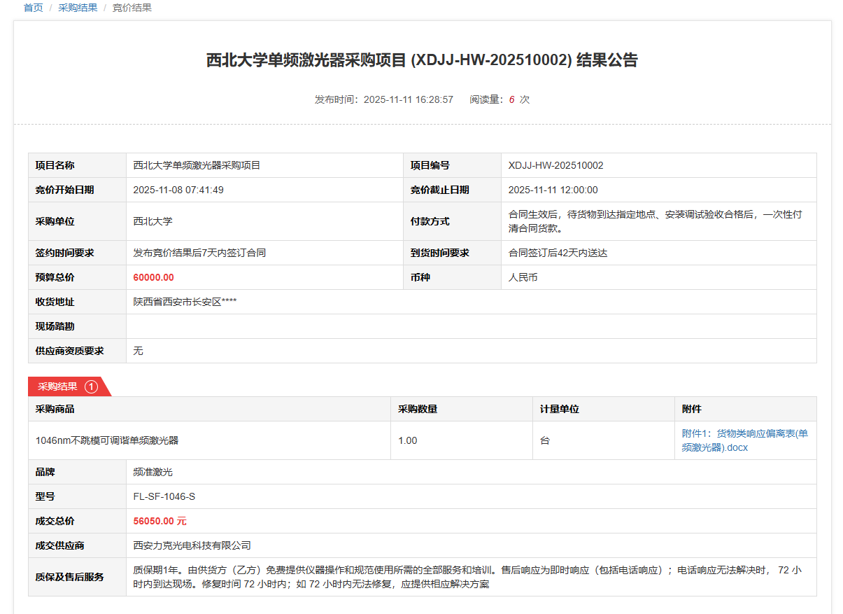 国产精品九九久久一区hh单频激光器采购项目(XDJJ-HW-202510002)竞价结果公告