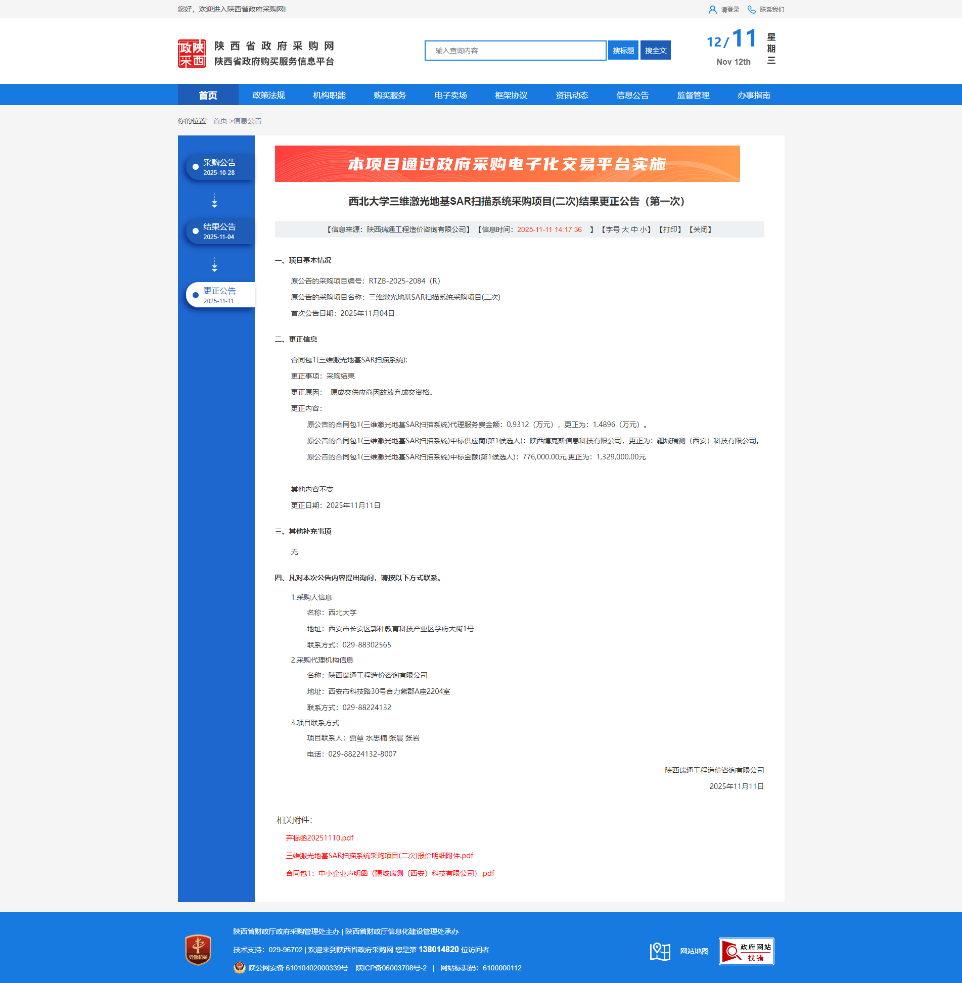 国产精品九九久久一区hh三维激光地基SAR扫描系统采购项目(二次)结果更正公告(第一次)