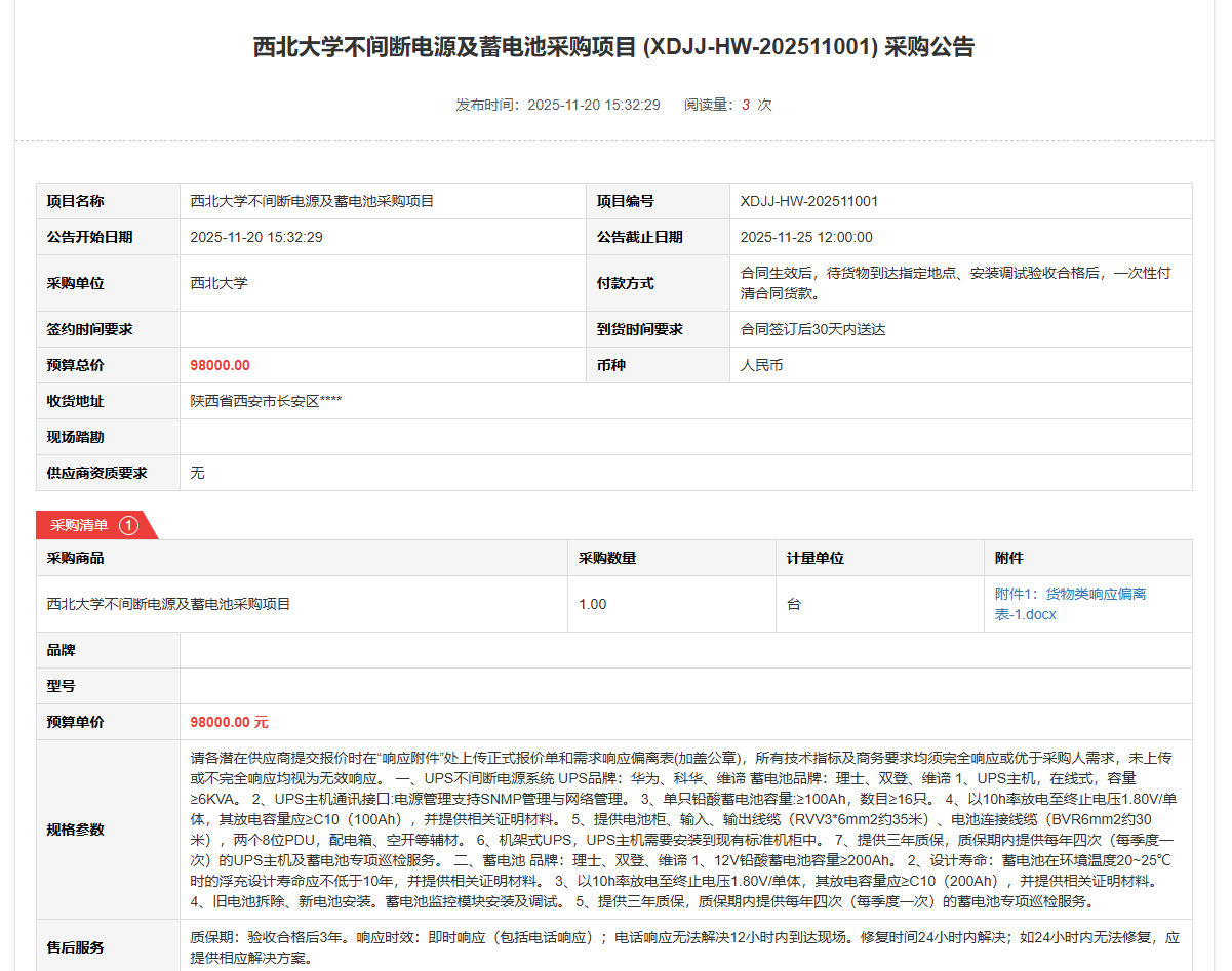 国产精品九九久久一区hh不间断电源及蓄电池采购项目(XDJJ-HW-202511001)竞价采购公告