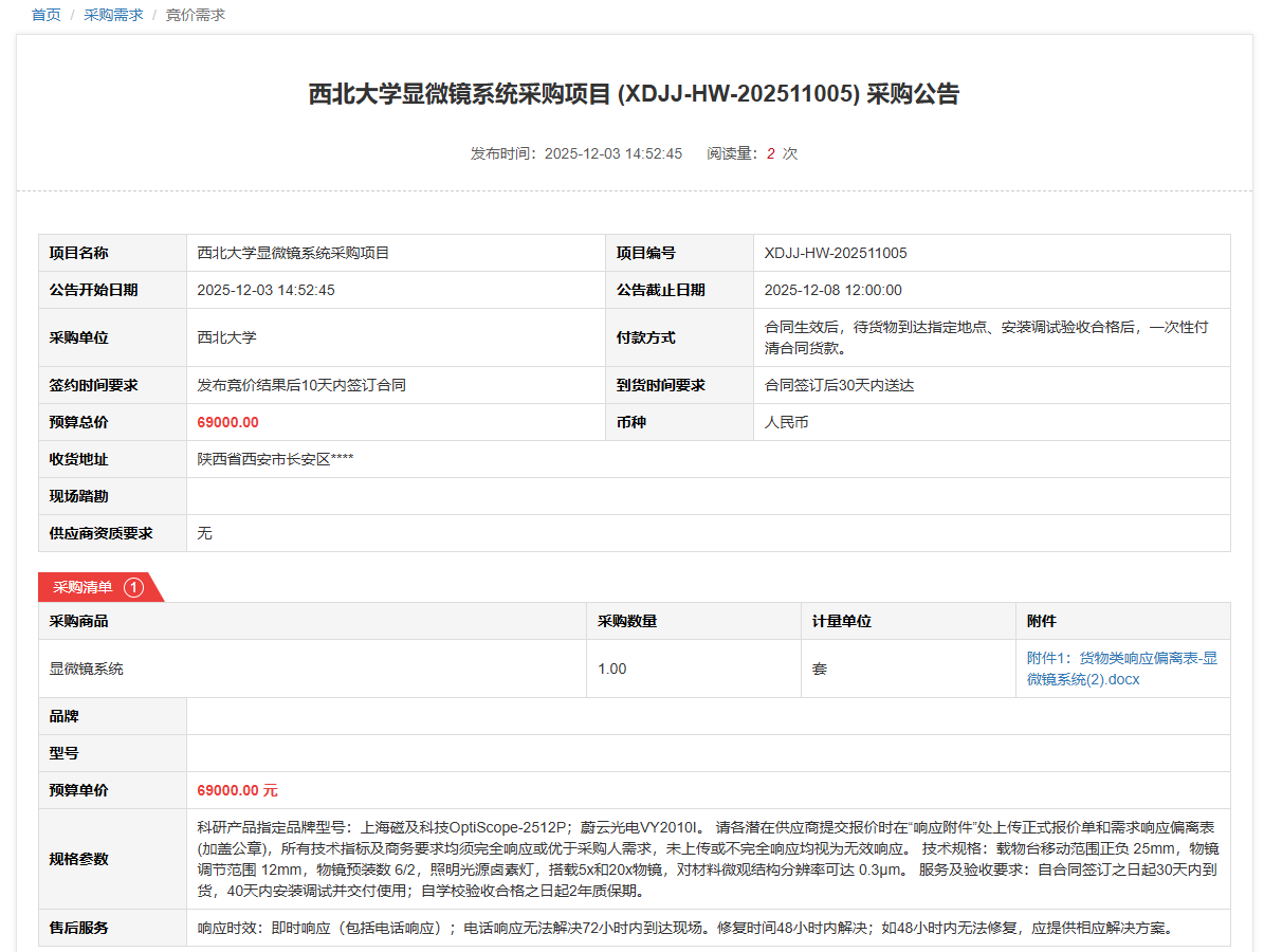国产精品九九久久一区hh显微镜系统采购项目(XDJJ-HW-202511005)竞价采购公告