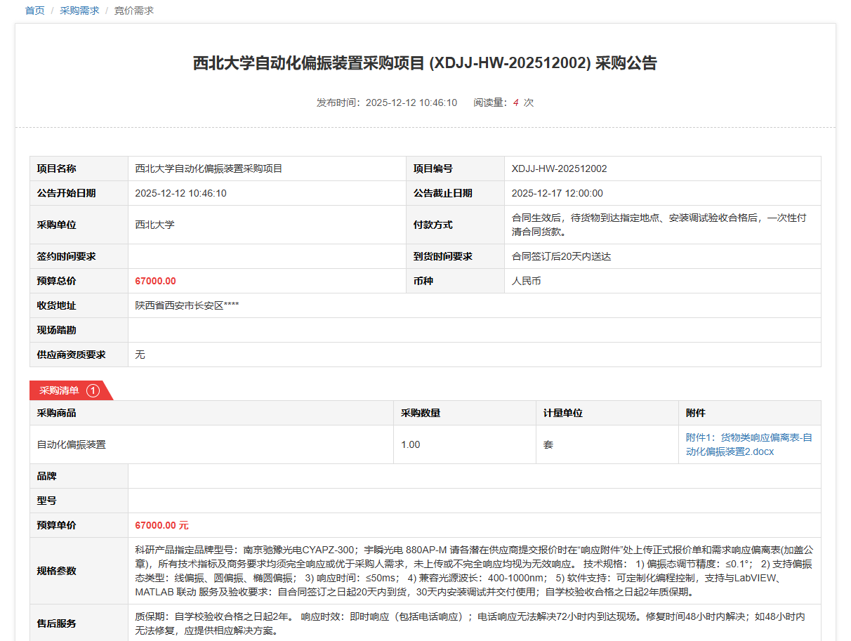 国产精品九九久久一区hh自动化偏振装置采购项目(XDJJ-HW-202512002)竞价采购公告