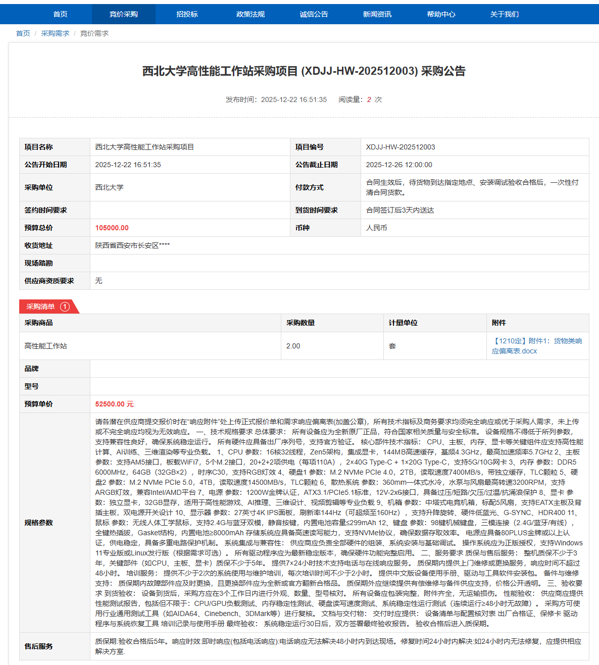 国产精品九九久久一区hh高性能工作站采购项目(XDJJ-HW-202512003)竞价采购公告