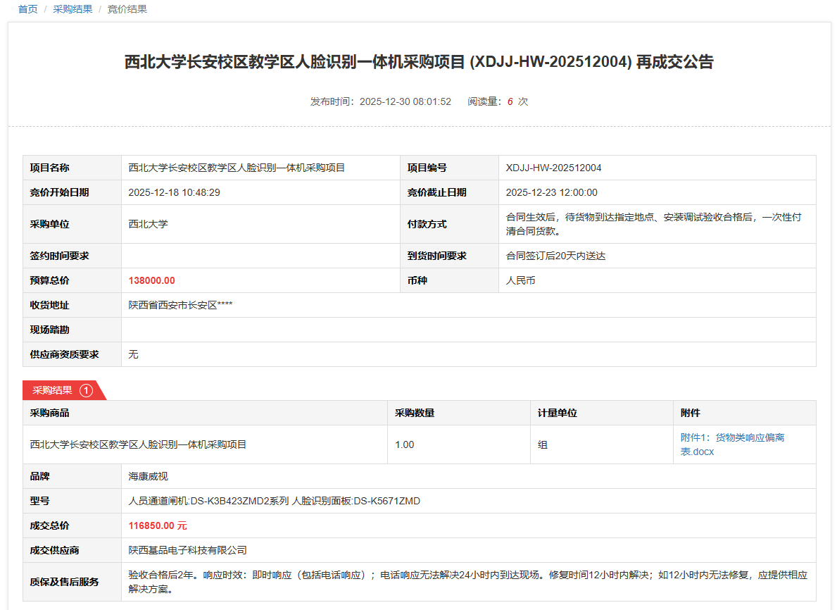 国产精品九九久久一区hh长安校区教学区人脸识别一体机采购项目(XDJJ-HW-202512004)竞价再成交公告