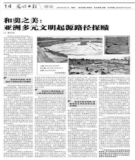 《和羹之美:亚洲多源文明起源路径探赜》2025年4月7日发表在《光明日报》理论版头条。文章认为,亚洲是人类文明重要发祥地。随着近年考古成果井喷,亚洲文明溯源已成为破解“西方中心论”桎梏、重构全球文明史观的关键密钥。文章提出亚洲三大原生文明起源的不同路径:西亚两河流域在环境危机驱动下催生契约型文明、东亚长江黄河流域通过观测天象构建“天人合一”为核心的礼制文明、南亚印度河流域凭借广泛的城市网络形成宗教理念主导的标准化城市文明。三大路径各异,却共同塑造了亚洲文明的灿烂,证明文明是多元共生的“和羹”。文章为建构文明起源研究中国话语体系,构建人类命运共同体提供启示。