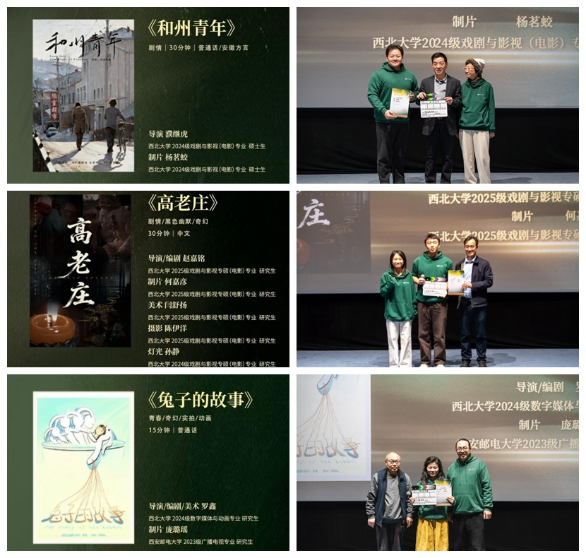 活动现场,20个入围团队进行了项目陈述、概念片展示,经过评审团专业评议,包括我校2024级戏剧与影视专业硕士研究生濮继虎、2025级戏剧与影视专业硕士研究生赵嘉铭和2025级戏剧与影视专业硕士研究生赵嘉铭分别担任导演/编剧的《和州青年》、《高老庄》和《兔子的故事》三部作品在内的十部作品脱颖而出,获评十强优胜项目,将获得专项拍摄资金及全链条孵化支持。