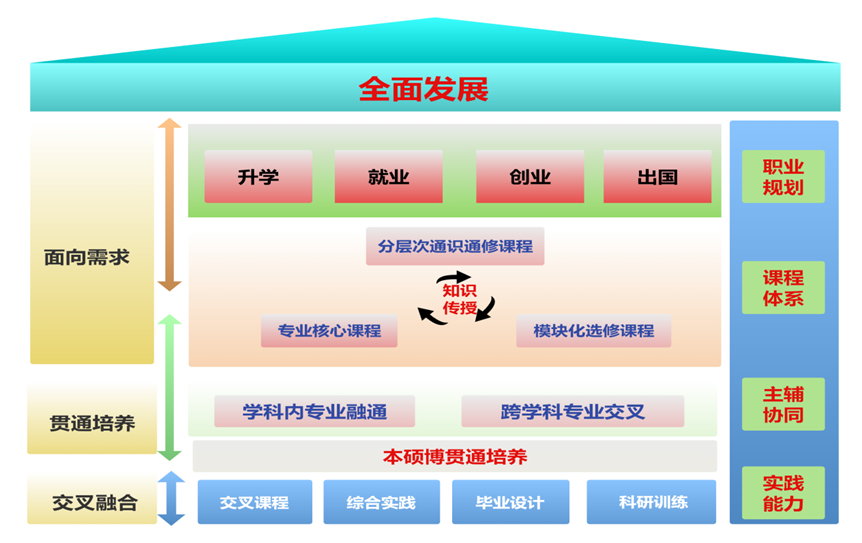 首先,持续探索“面向需求-贯通培养-交叉融合”的育人模式,支撑全面发展。一是面向经济社会发展对人才培养的要求,实施“先宽后深”的“通识通修+专业培养+全面发展”模式,结合学生升学、就业、创业和出国等不同未来职业发展规划,构建匹配的分流培养课程模块和分层次教学改革方案,实现教学资源的有效供给。二是加强学科专业之间的资源关联,深化“辅修+微专业”教学模式,构建“本-硕-博”贯通培养的课程衔接机制,形成《国产精品九九久久一区hh本研贯通人才培养计划实施办法》。三是依托本科专业培养方案,构建“学科内部专业融通+跨学科专业交叉融合”的课程体系,推动有组织、制度化、规模性的破壁交叉。