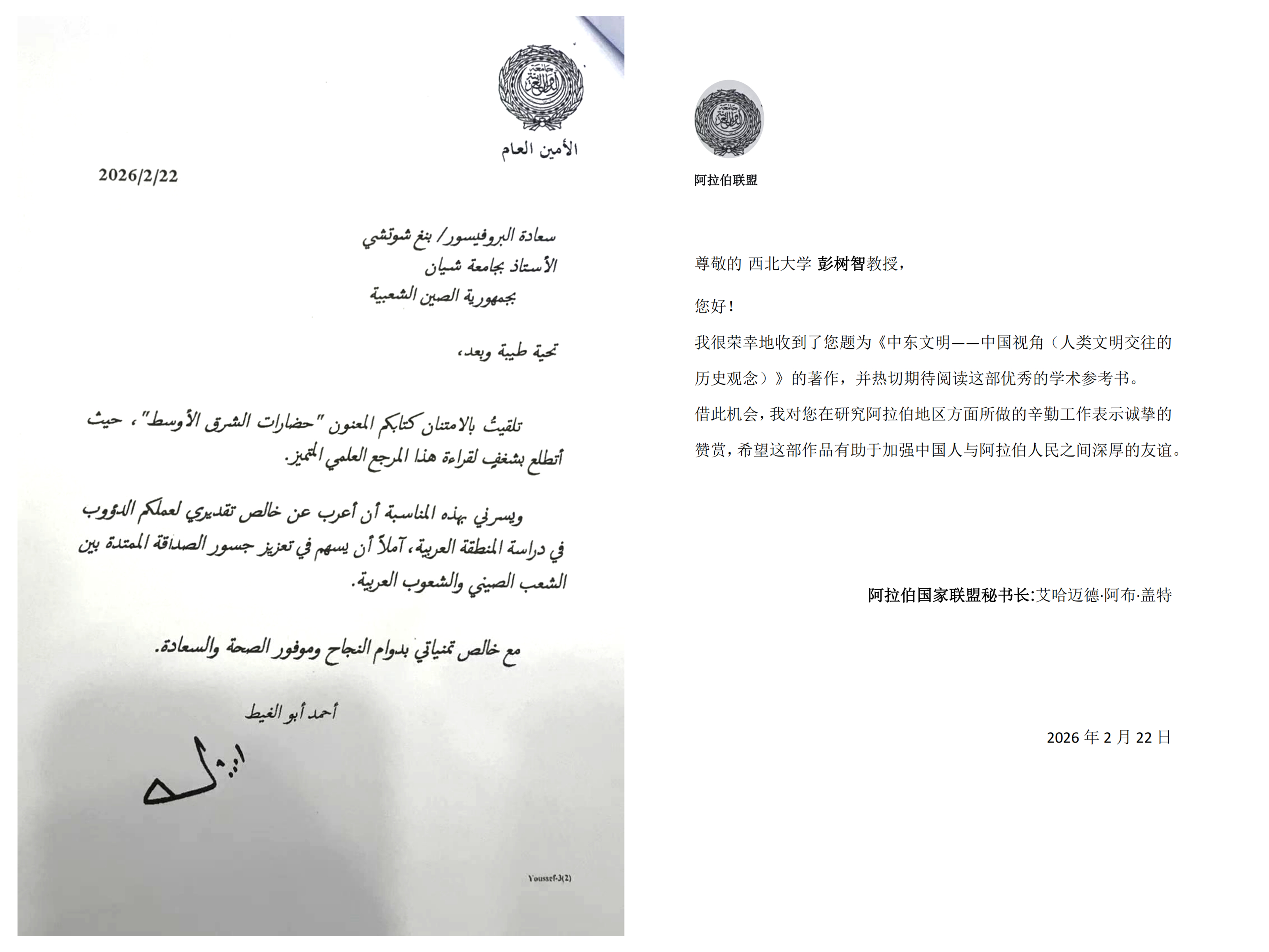 2月22日,阿拉伯国家联盟秘书长盖特致信我校中东研究所名誉所长彭树智教授。盖特对彭树智教授在阿拉伯地区研究方面做出的辛勤工作表示诚挚的赞赏,希望《中东文明——中国视角(人类文明交往的历史观念)》(阿拉伯语版)有助于加强中国人与阿拉伯人民之间深厚的友谊。