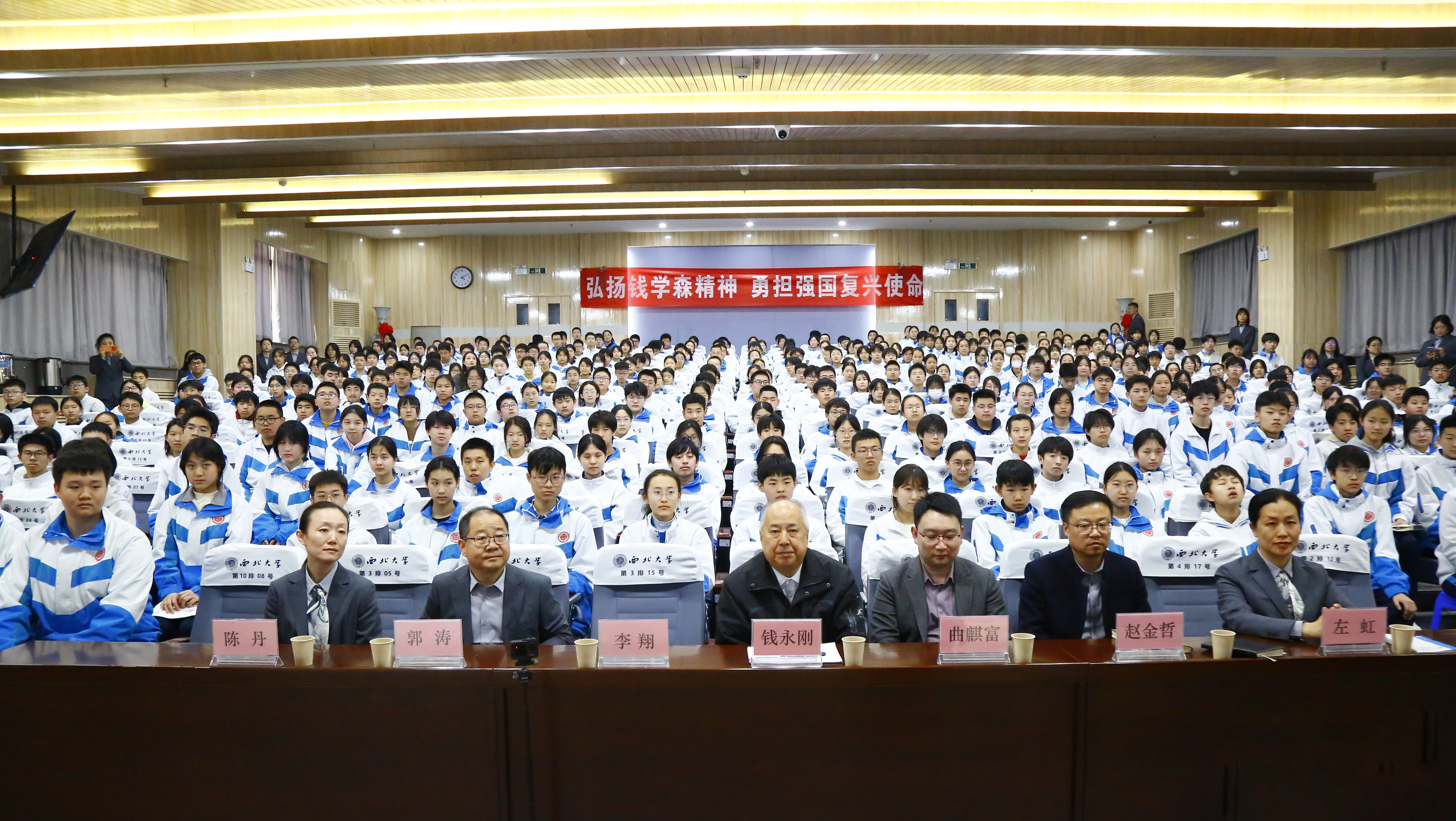 报告会前,钱永刚观摩了附中学生合唱团演唱的《我爱你中国》、钱学森纪录片《仰望星空》主题曲《飞翔的路》两首曲目,并与学生们座谈,对合唱团的表演进行点评,提出指导意见,勉励学生们要善于从音乐等艺术形式中汲取灵感,开阔视野,培养自主学习能力,以此打开探索世界的大门。