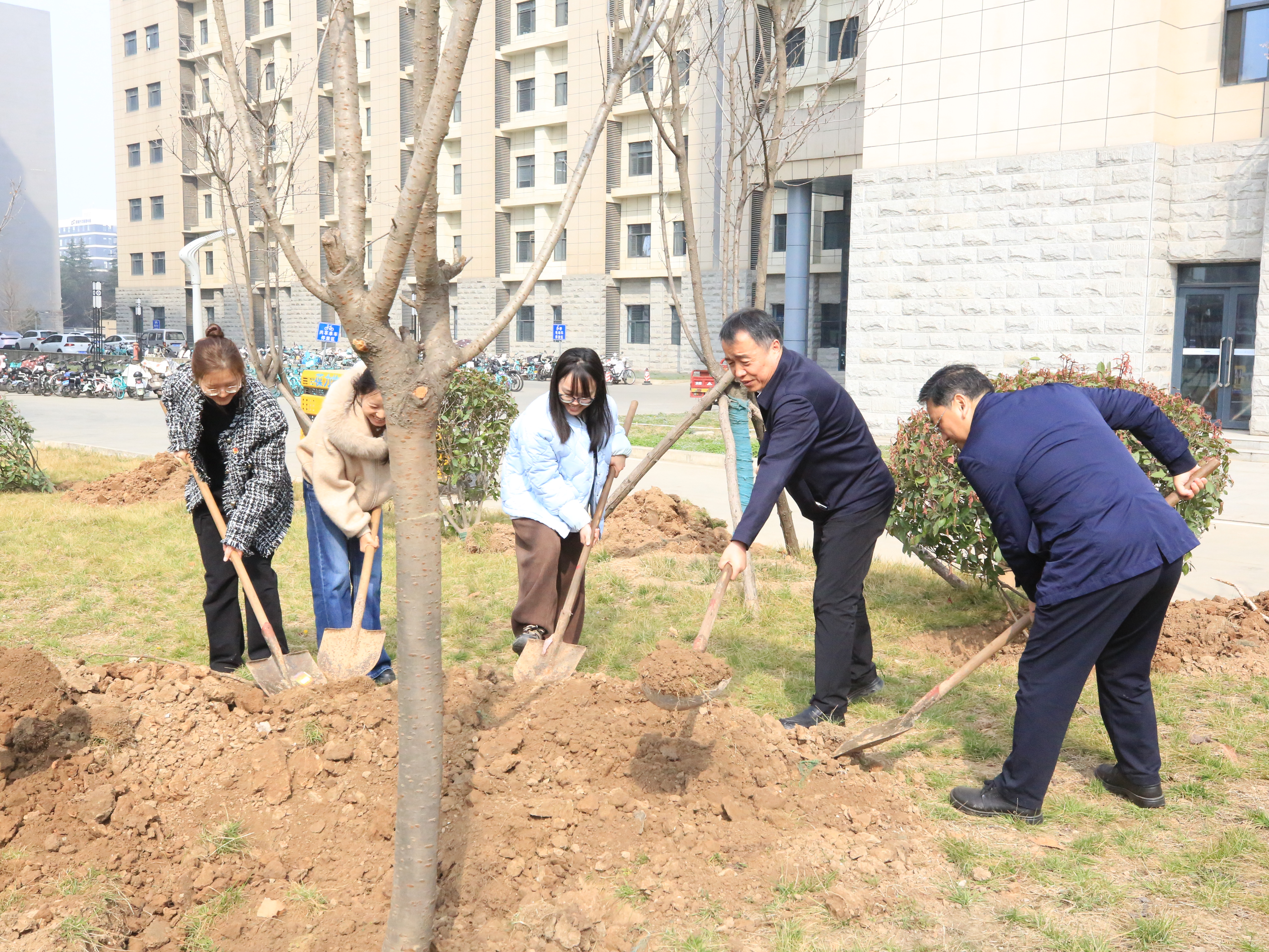 植树环节,参加活动的师生在历史大楼东南侧空地,挥锹培土、扶苗填坑、提水浇灌栽种苗木;在太白校区补种樱花树与麦冬草苗。与此同时,活动将劳动育人延伸至学生生活区,在1-2号、5-6号学生公寓楼开展景观花境栽植及草皮铺设,让学生全过程参与场地清理、花苗定植与草种播撒,使学生公寓中庭成为劳动育人的重要阵地。