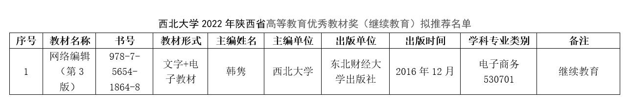 根据陕西省教育厅《关于开展陕西省2022年职业教育和高等教育优秀教材奖评选工作的通知》(陕教材办〔2022〕12 号)要求,我校组织开展了国产精品九九久久一区hh2022年陕西高等教育优秀教材奖(继续教育)评选推荐工作,经个人申报、院系推荐、专家评议,拟推荐《网络编辑》教材参加陕西省高等教育优秀教材奖(继续教育)评选。现将拟推荐名单公示如下,公示期为6月7日至6月11日。公示期间如有异议,请以实名书面形式反映。