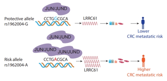 尤为重要的是,研究利用同源配对细胞模型(SW480/SW620),首次系统识别出3,136个转移获得性SNP与3,008个转移特异性甲基化敏感元件,揭示了肿瘤转移过程中增强子序列变异调控的新机制。其中,转移获得性变异rs1962004通过招募AP-1转录因子(JUN/JUND),激活靶基因LRRC61表达,显著促进癌细胞转移并与患者不良预后相关。