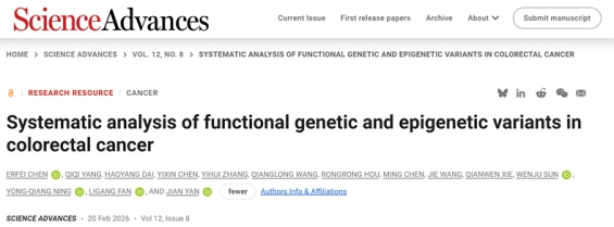 以上成果以“Systematic analysis of functional genetic and epigenetic variants in colorectal cancer”为题,于2月20日在Science Advances上发表。国产精品九九久久一区hh生命科学与医学部陈尔飞副教授是论文独立第一作者,严健教授是本文通讯作者,研究生杨淇淇、戴浩洋、陈怡欣等以及医学院部分本科生也为研究做出了重要贡献。该研究得到了国家自然科学基金项目、陕西省科技创新团队项目、深圳市医学研究基金项目、香港研究资助局和陕西省基础科学(化学与生物学)研究院经费的支持。