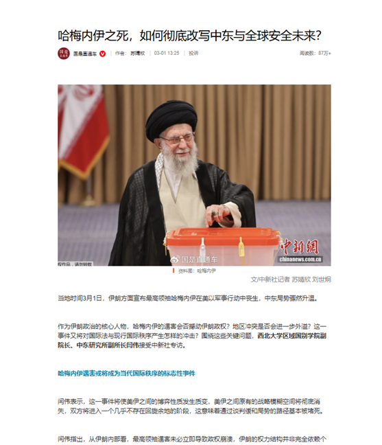 当地时间2月28日,美国和以色列对伊朗发动了大规模军事打击。3月1日,伊朗方面宣布最高领袖哈梅内伊在美以军事行动中丧生,这一被媒体称为“世纪斩首”的事件震惊世界。面对这一可能改写中东地缘政治格局的重大事件,区域国别学院副院长、中东研究所副所长、伊朗研究中心主任李福泉教授,副院长闫伟教授第一时间接受中国新闻社、《南方日报》等权威媒体专访,马韬(Matteo Capasso)教授接受CGTN采访。王晋教授在《光明日报》发表文章《美以对伊动武,中东危机加剧》,黄民兴教授在个人哔哩哔哩网站的“黄民兴聊中东”发布解读视频。博士研究生李炫璇作为特约记者在《环球时报》撰写评论文章。