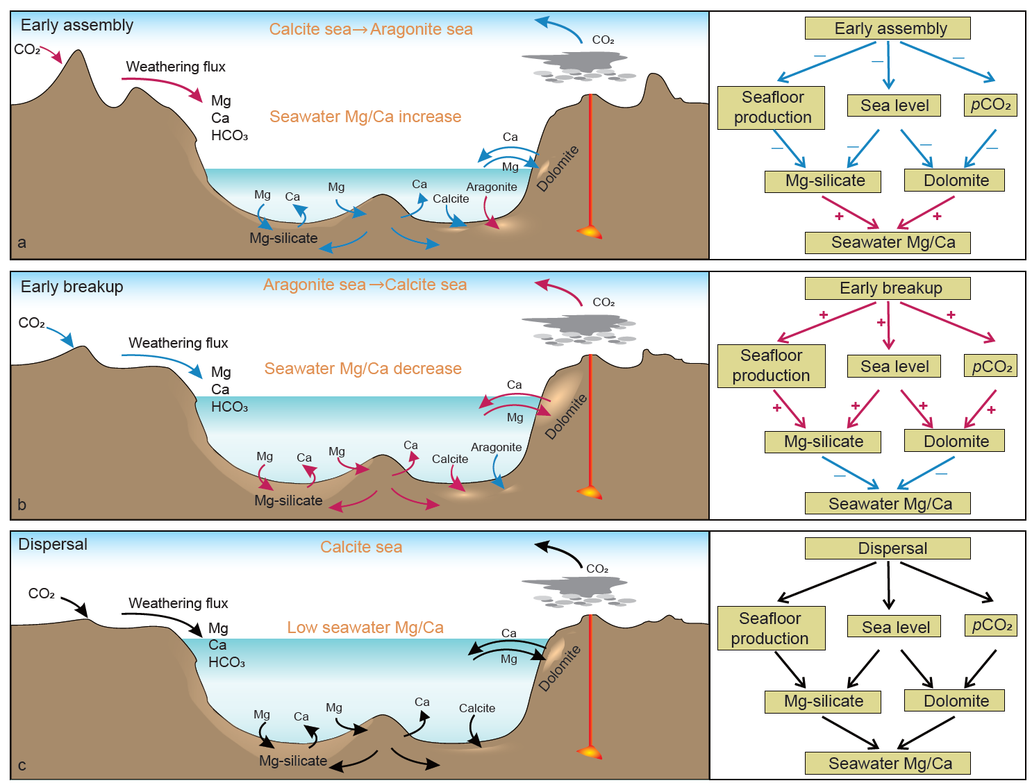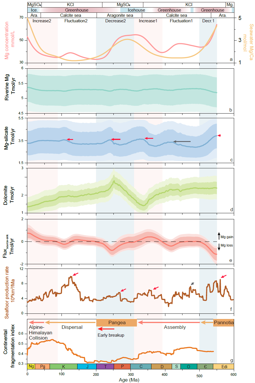 图2:显生宙海水Mg/Ca变化(a)、海洋镁汇(b–e)及板块构造演化(f–g)