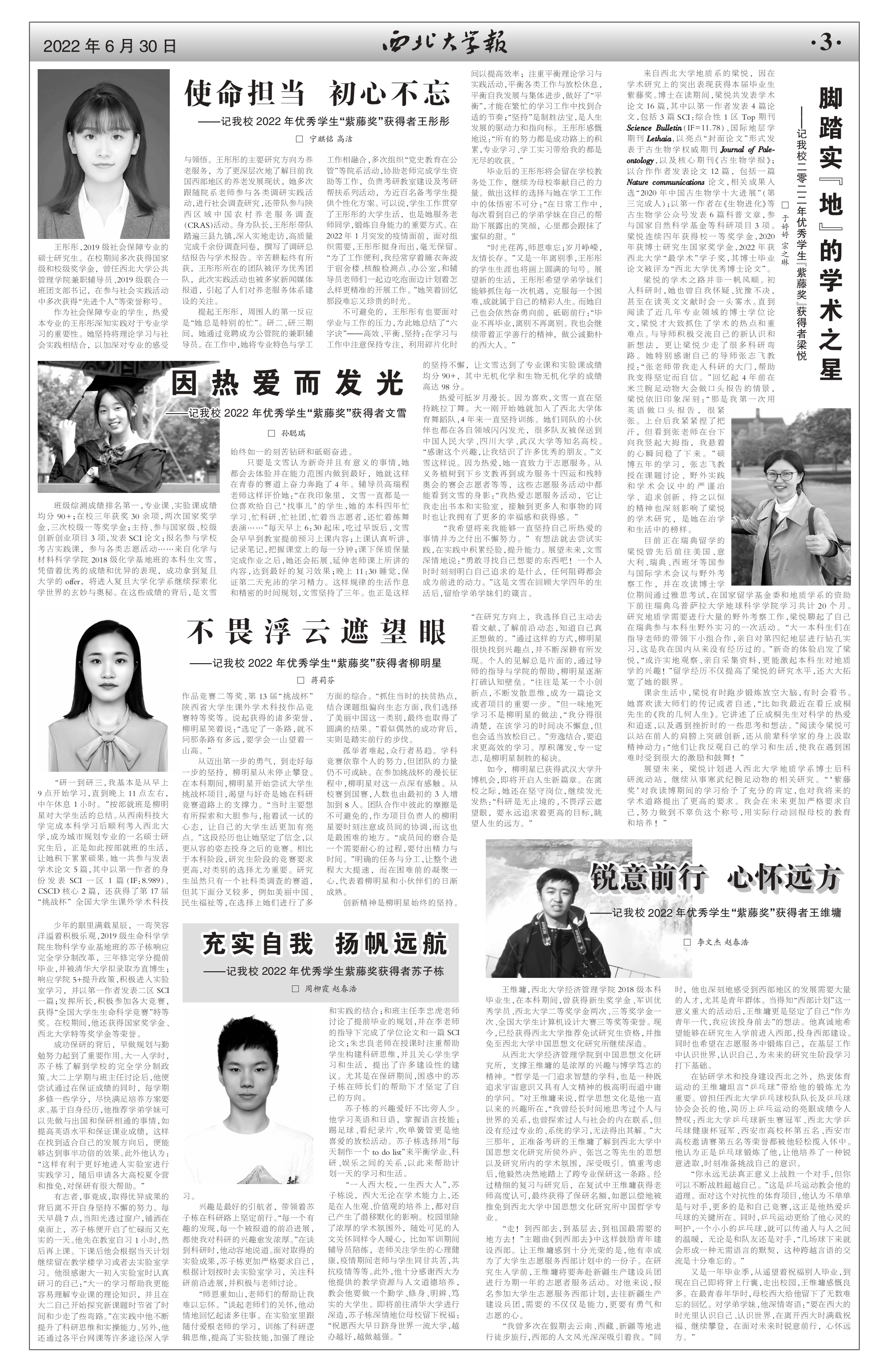 又是一年毕业季,从遥望着祝福别人毕业,到现在自己即将背上行囊,走出校园,王维墉感慨良多。在最青春年华时,母校西大给他留下了无数难忘的回忆。对学弟学妹,他深情寄语:“要在西大的时光里认识自己、认识世界,在离开西大时满载祝福、继续攀登,在面对未来时锐意前行,心怀远方。”