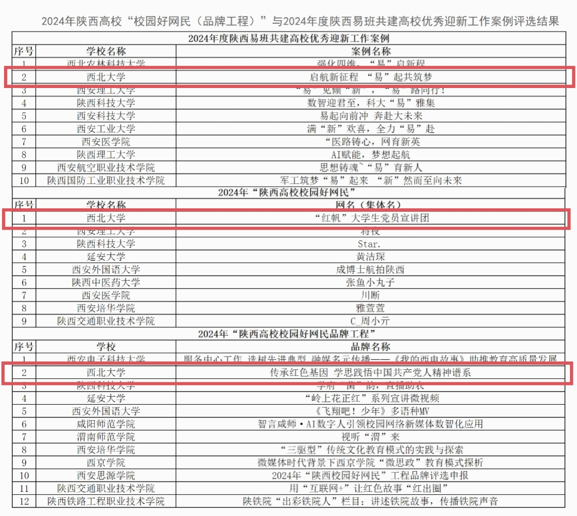 近日,陕西高校网络思想政治工作中心公布了2024年陕西高校“校园好网民(品牌工程)”与2024年度陕西易班共建高校优秀迎新工作案例评选结果,我校“红帆”大学生党员宣讲团获评陕西高校2024年校园好网民,“传承红色基因 学思践悟中国共产党人精神谱系”项目获评2024年“陕西高校校园好网民品牌工程”,“启航新征程 易起共筑梦”项目获评2024年度陕西易班共建高校优秀迎新工作案例。