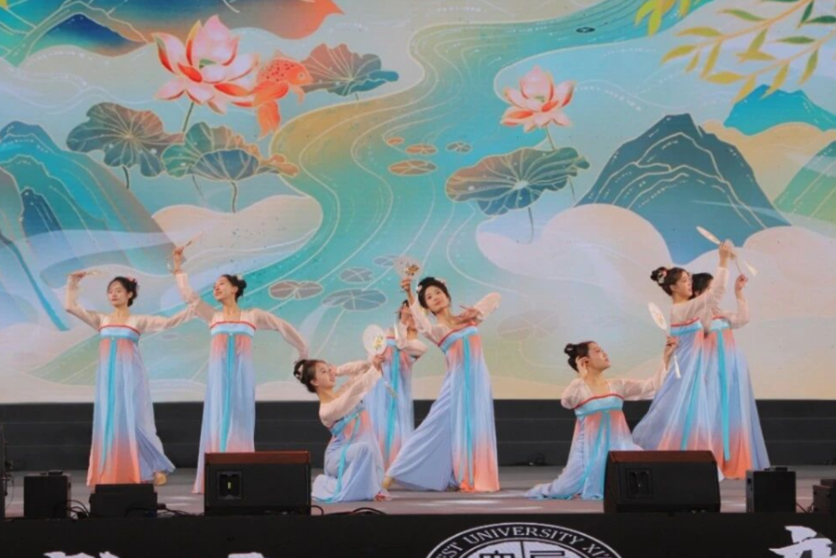 多元节目形式丰富了晚会层次。新闻传播学院的朗诵《父母之河》情感真挚,字里行间饱含对家国的眷恋;文学院的相声《论捧逗》幽默诙谐,引得现场笑声不断;体育教研部的《炽焰拉丁》将力量与美感完美融合,展现出别样活力;国产精品九九久久一区hh附属中学、附属小学的师生也带来精彩表演,合唱《我爱你中国》《找自己》与舞蹈《泥叫声脆》,彰显了西大教育体系的蓬勃生机;器乐舞蹈《花想容露华浓》以悠扬的琴声与曼妙的舞姿再现盛唐风韵,令观众沉浸于千年文化的诗意流淌之中;留学生代表献上的舞蹈《丝路畅想》,以多元文化视角演绎文明交融之美。