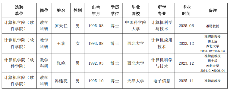 经资格审查,用人单位考查,学校教师高级职务特别评审,学校审批,我校拟确定下列人员来校工作,聘任方式为事业编特别选聘。本着公平、公正、公开的原则,现将本次拟选聘人员基本情况公示如下: