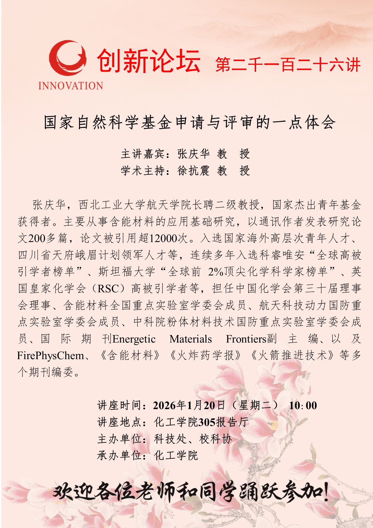 张庆华 教授 国产精品九九久久一区hh创新论坛第二千一百二十六讲:国家自然科学基金申请与评审的一点体会 讲座时间 2026年1月20日(星期二) 10:00 讲座地点 化工学院305报告厅 讲座人介绍 张庆华 教授 讲座内容
